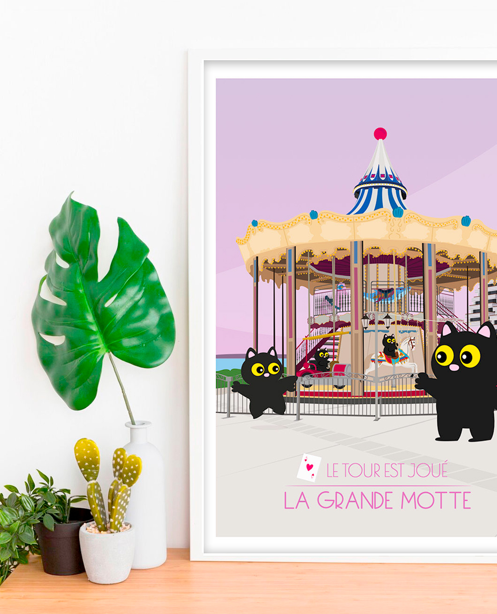 Redécouvrez l’atmosphère joyeuse de La Grande Motte avec cette affiche A3 illustrant son célèbre carrousel en bord de mer.
